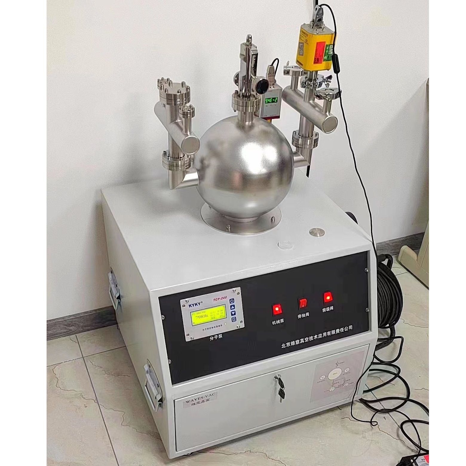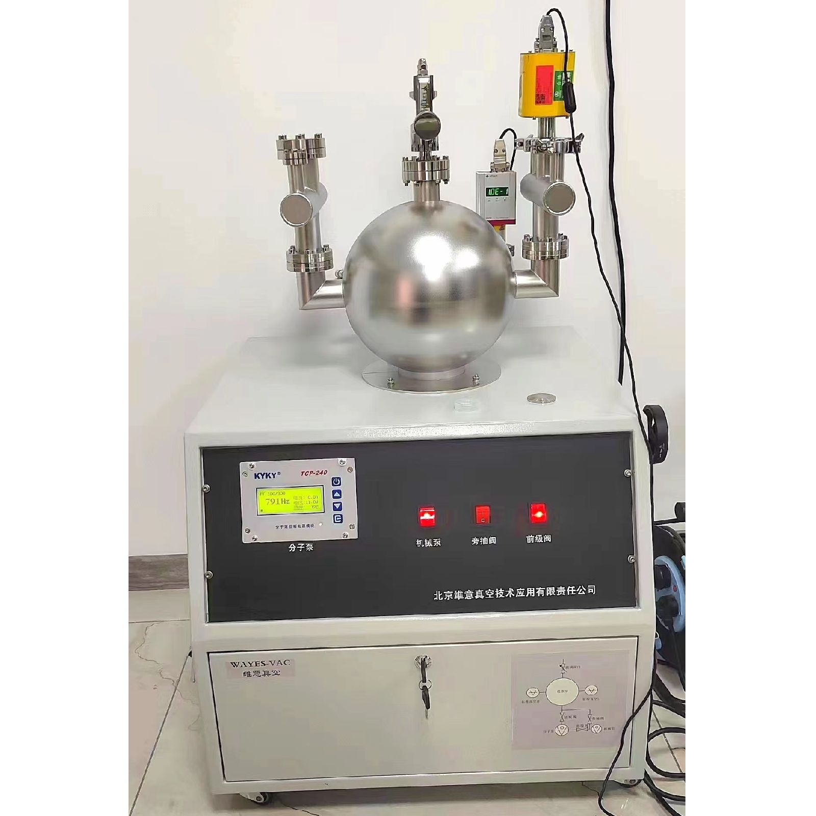 机箱的要求:1、机箱侧面有把手,底部带有刹车轮,便于整体抬动和移动;2、真空控制器和分子泵控制器面板安装在正面,便于操作者观察;3、分子泵安装需要进行加固;4、机械泵安装有隔振设计;5、校准室保护箱体易于拆卸。6、有电气设计,包括机械泵、分子泵控制器、真空控制器、电磁阀,充气阀的供电设计。整套装置有总开关,电磁阀有开关,机箱正面画校准原理图,将电磁阀开关安装在原理图相应位置处。