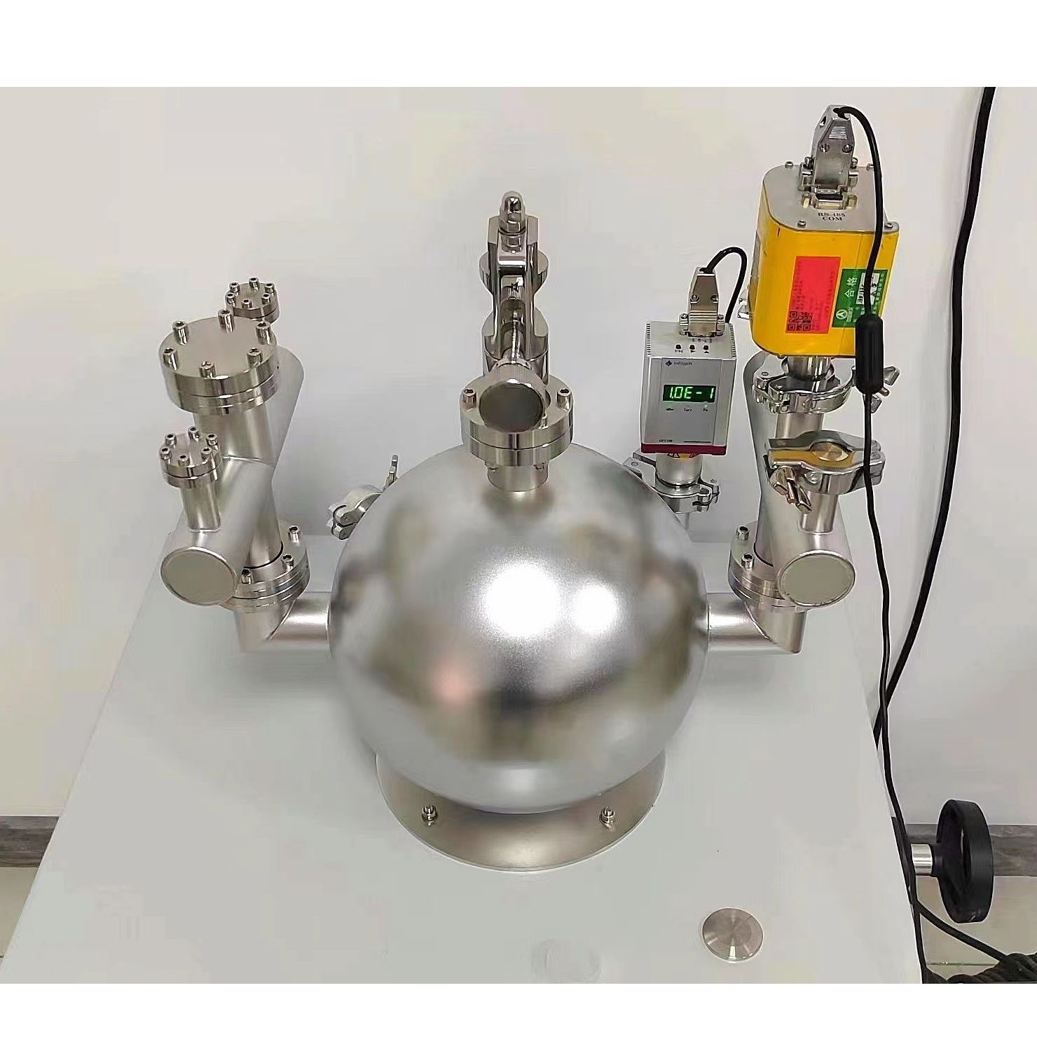 四通1要求:一端为CF35接口,另外三个接口为VCR接口,用于安装VCR接口的电容薄膜真空规,并在真空规下面安装有截止阀。(要求体积和长度尽可能小)